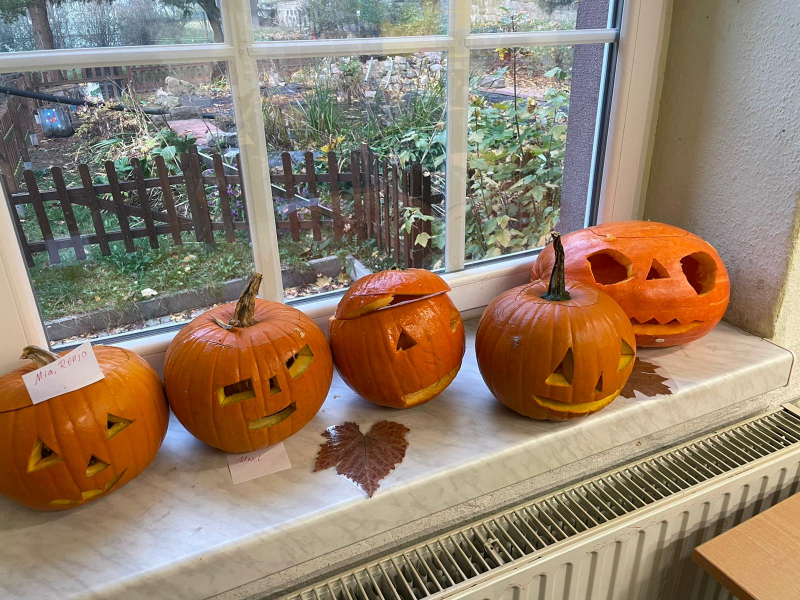Dank einer großzügigen Spende konnten über 50 Kürbisgeister in die Schule einziehen. Doch mit dem letzten Schultag mussten sie leider alle das Schulgebäude verlassen. Zu Halloween werden sie dann bei den Kindern zu Hause rumgeistern.