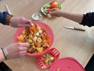 Während es in der 4. Klasse mit der Atmung und dem Blutkreislauf weiter ging, haben unsere Finken der Schuleingangsphase ein leckeres gesundes Frühstück mit Gemüsesticks und Kräuterquark sowie Obstsalat gezaubert.